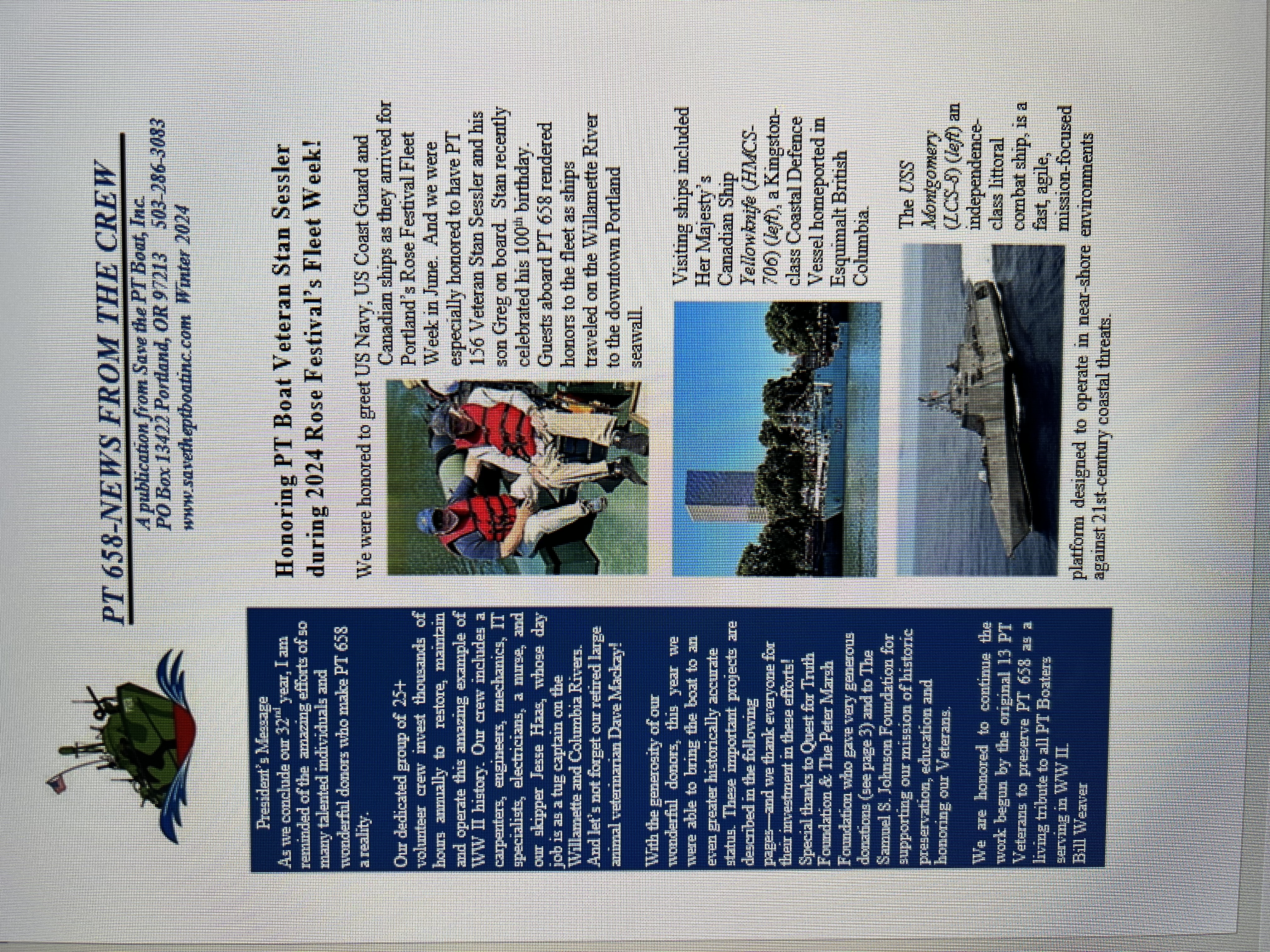 2024 Yearend Newsletter Save The PT Boat, Inc's. Yearend 2024 Newsletter issue (16 page PDF file) is now available. To View the .PDF issue Click Here |