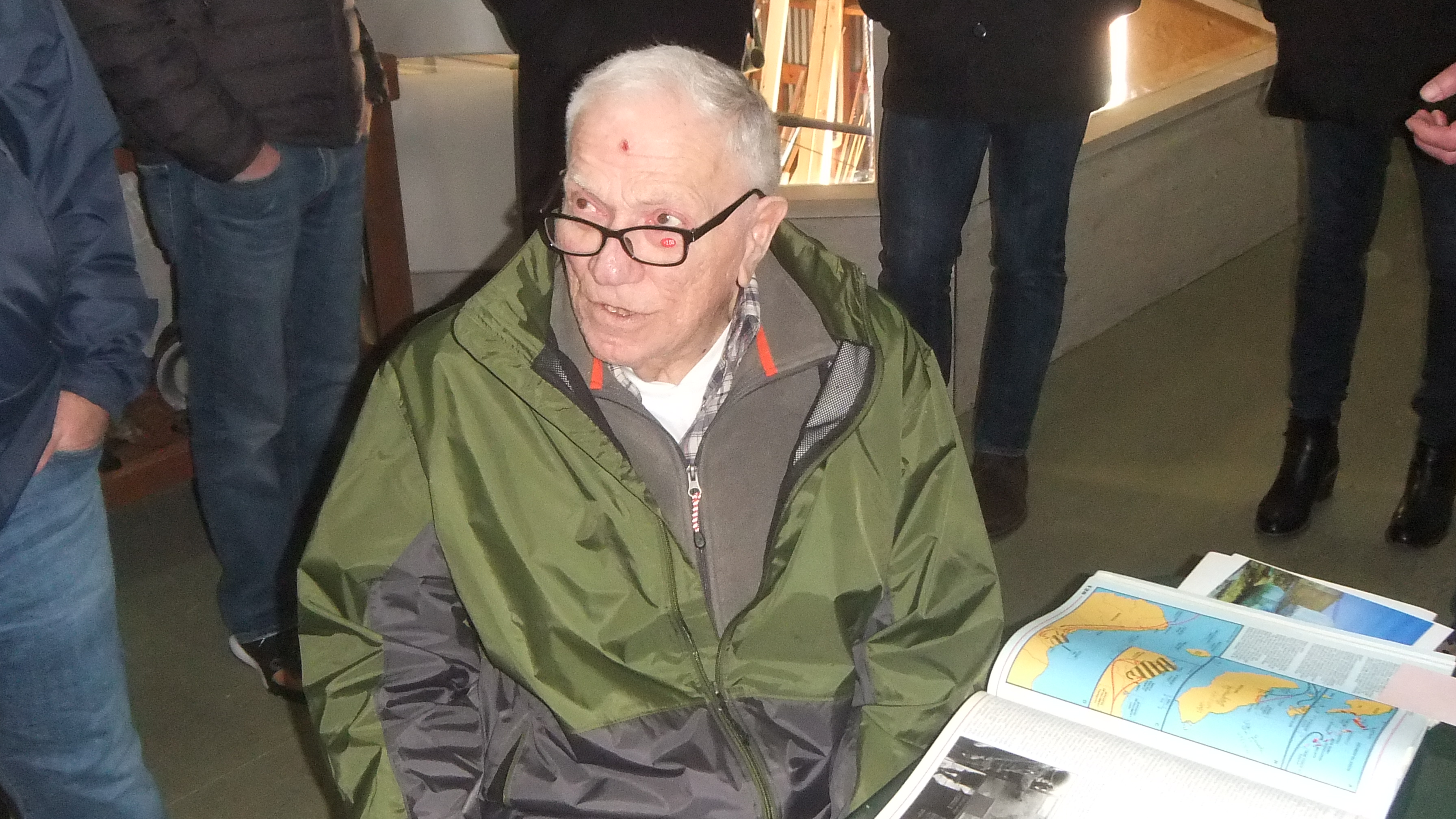 Wally Boerger, Bill Weaver and Jerry Gilmartin with 1919A4 Browning 30 cal machine gun they donated to boat |